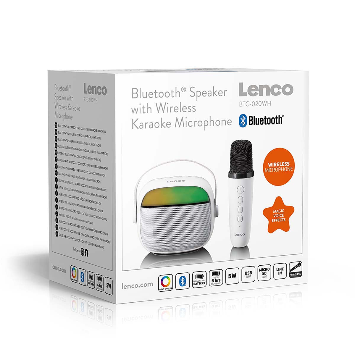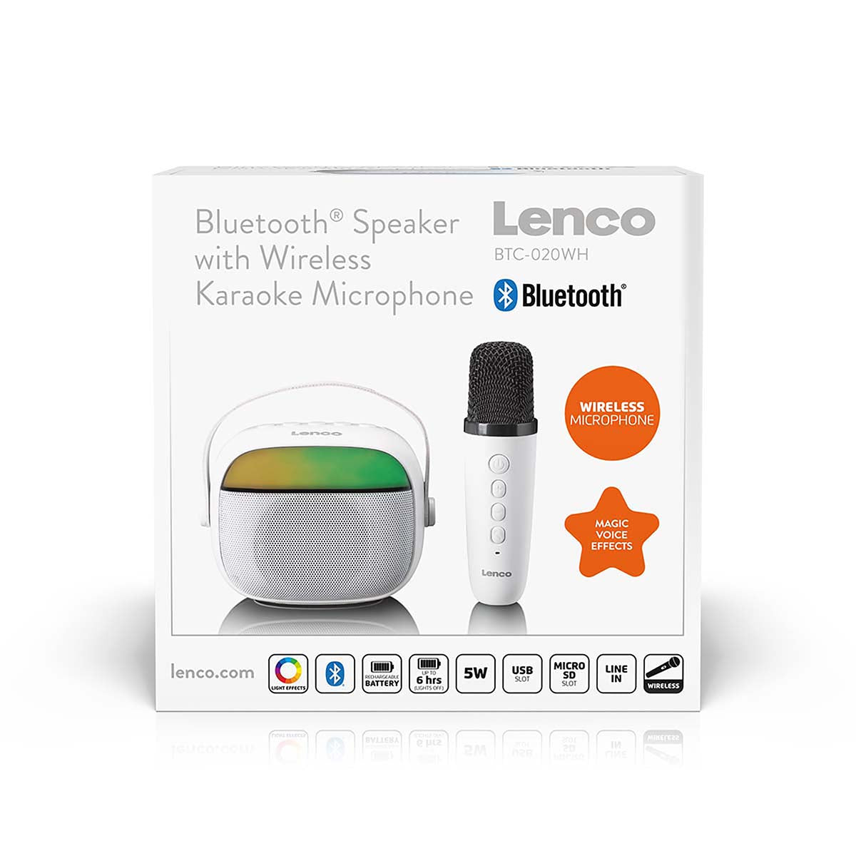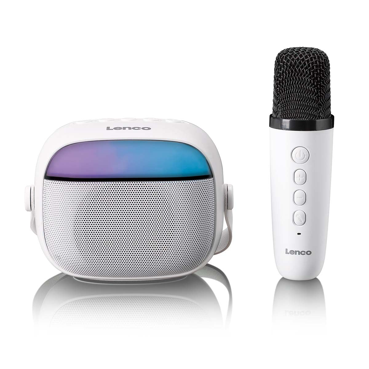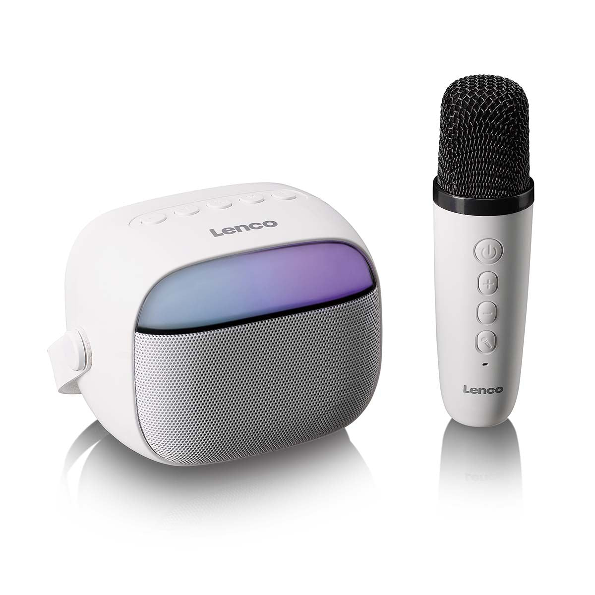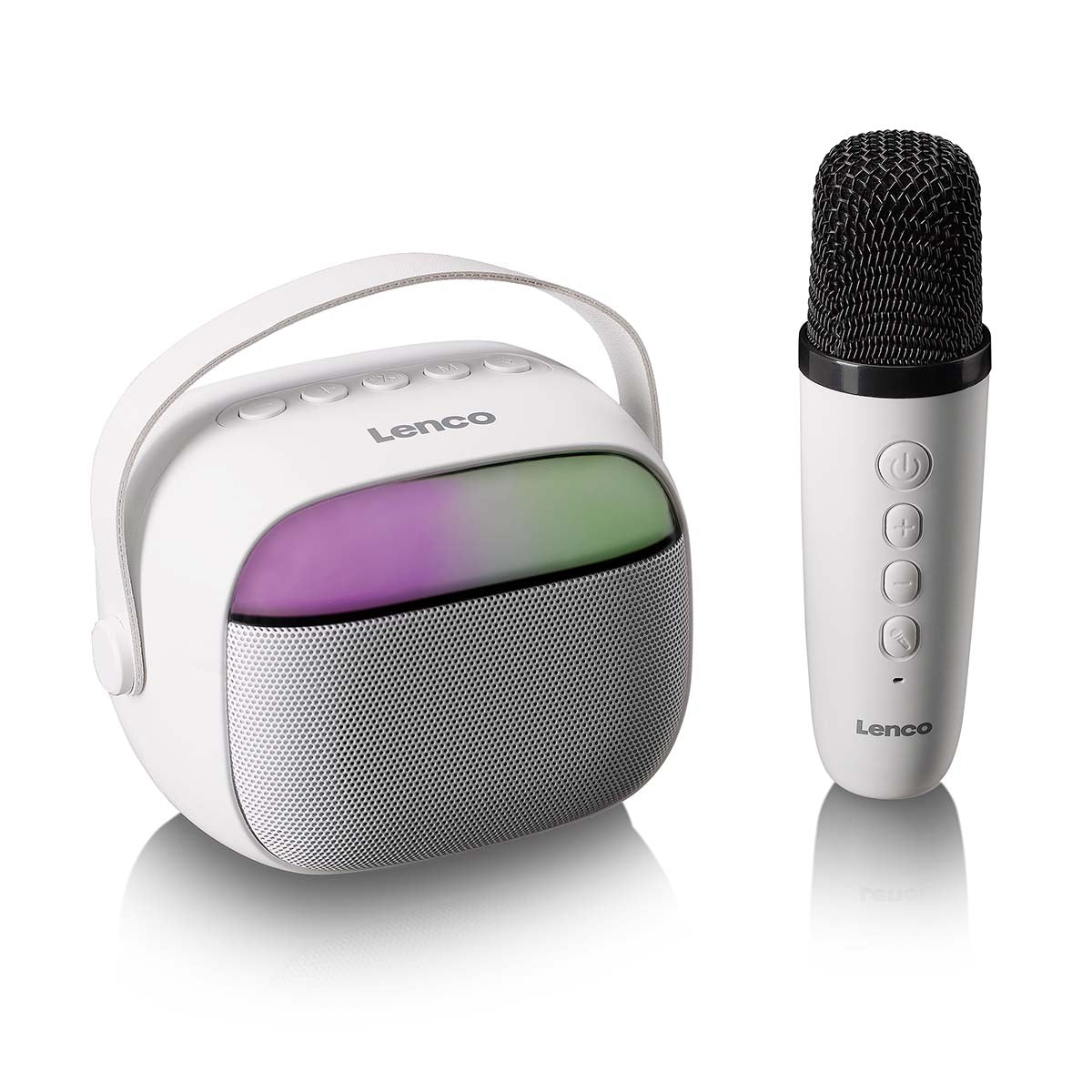 Mit dem Lenco BTC-020WH holen Sie sich einen kompakten und benutzerfreundlichen Karaoke-Lautsprecher ins Haus – ausgestattet mit Bluetooth®, einem wiederaufladbaren Akku, einem kabellosen wiederaufladbaren Mikrofon und farbenfrohen LED-Lichteffekten. Dieses kleine Kraftpaket eignet sich perfekt für spontane Karaoke-Momente, Kindergeburtstage oder einfach zum gemeinsamen Musikhören. Dank des leichten und tragbaren Designs nehmen Sie den BTC-020 mühelos überallhin mit. Verbinden Sie Ihr Smartphone, starten Sie Ihren Lieblingssong – und schon kann das Singen beginnen.