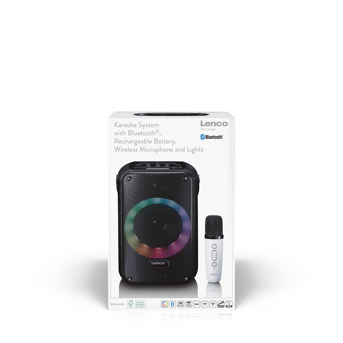 Mit dem Lenco BTC-060WH holst du dir direkt ein komplettes Karaoke-Set nach Hause, ausgestattet mit unter anderem Bluetooth®, wiederaufladbarem Akku, drahtlosem wiederaufladbarem Karaoke-Mikrofon, Disco-LED-Beleuchtung und einer Fernbedienung mit Soundeffekten und Stimmenverzerrer. Wir können es uns kaum vorstellen, aber sind Sie nicht ein Fan von Karaoke? Dann ist das BTC-060WH trotzdem die richtige Wahl! Das Karaoke-Mikrofon lässt sich bequem im Bluetooth-Lautsprecher verstauen. Dank des tragbaren Designs und einem Gewicht von nur 1,42 kg kannst du den Lautsprecher überallhin mitnehmen. Genieße bis zu 12 Stunden ununterbrochenen Spaß mit dem eingebauten wiederaufladbaren 2400mAh-Akku. Mit dem Lenco BTC-060WH hast du buchstäblich die Party in deiner Hand! Let's get this (karaoke) party started!