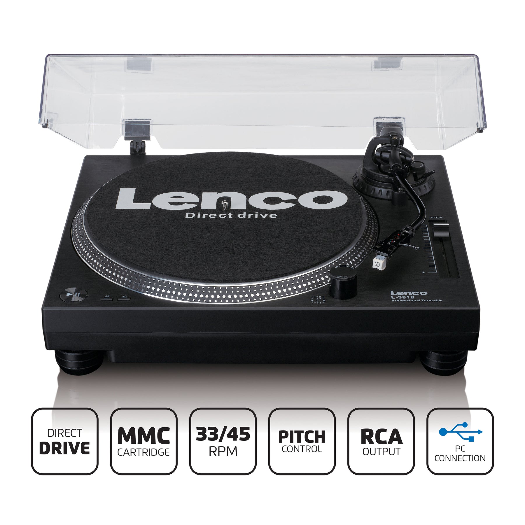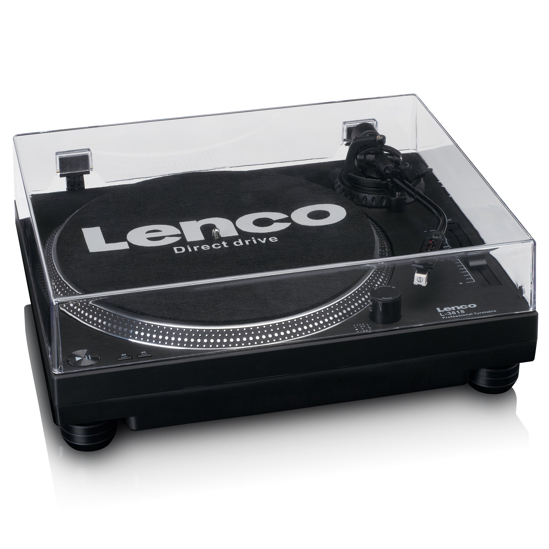 Der Lenco L-3818 ist ideal für DJs und diejenigen die professionell mit Platten und LPs umgehen. Die Direct-Drive-Funktion (Schnellstart) sorgt dafür, dass die Platte sofort auf Geschwindigkeit ist.