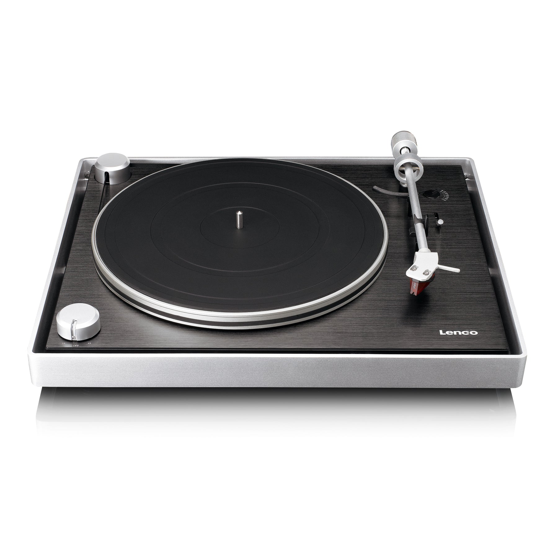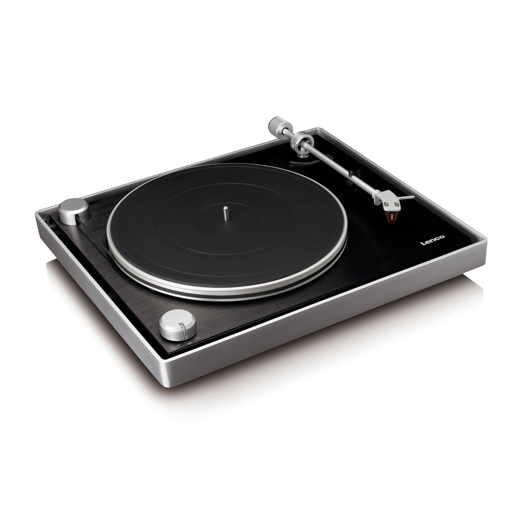 Ein Blick auf den Lenco L-455BK zeigt sofort die harmonische Kombination aus der eleganten schwarzen Oberfläche und dem gebürsteten Aluminiumrahmen. Diese hochwertige Verarbeitung verleiht dem Plattenspieler ein luxuriöses Erscheinungsbild, wobei auch der Tonarm nicht unbemerkt bleibt. Der minimalistische Tonarm überzeugt durch ein schlichtes und unkompliziertes Design. Der fein gearbeitete Metallplattenteller strahlt zudem eine Eleganz aus, die perfekt mit dem Gesamtkonzept harmoniert. Und das ist noch nicht alles – wir haben noch nicht einmal über den Tonabnehmer gesprochen!