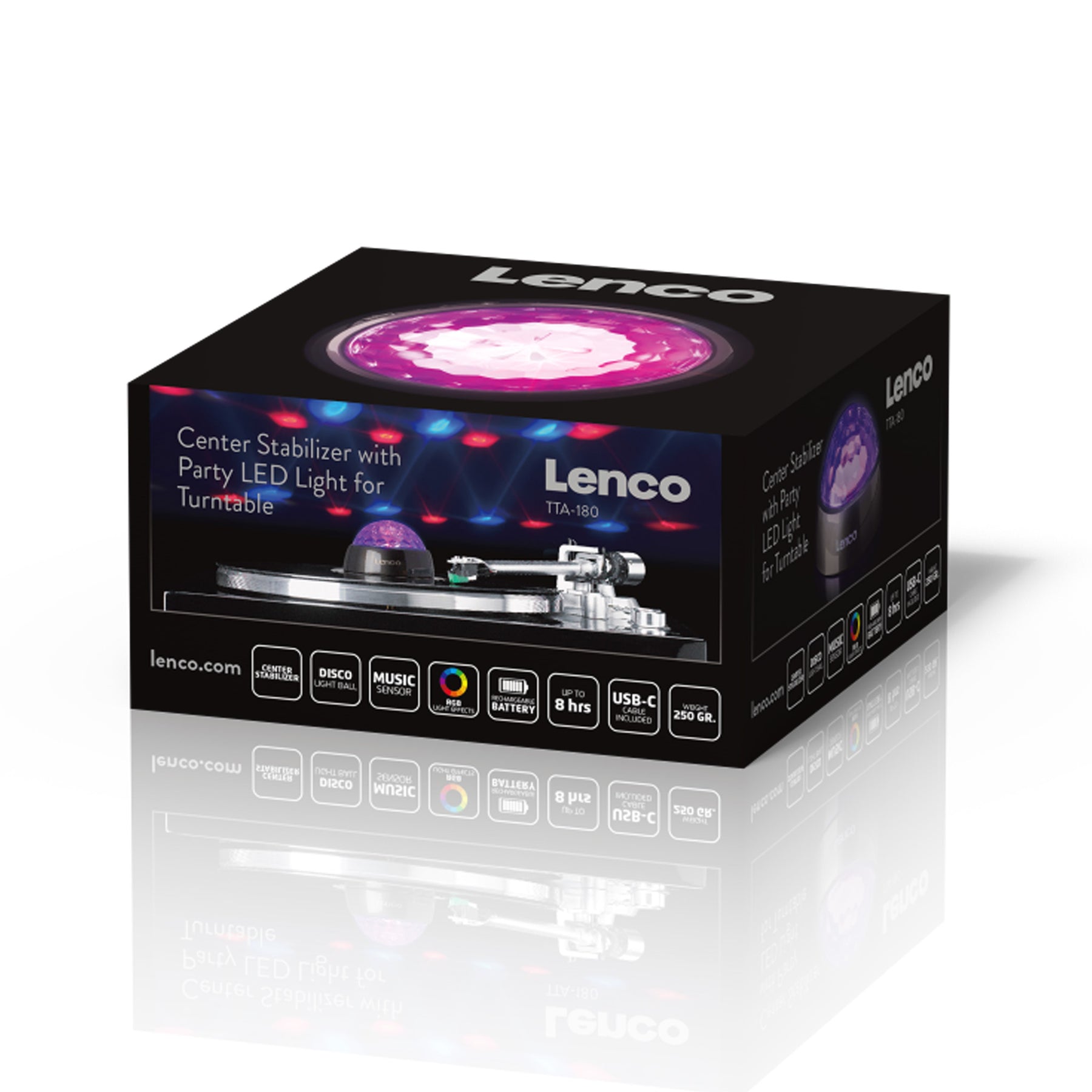 Egal, ob Sie ein Audioliebhaber sind, der Perfektion in der Klangwiedergabe sucht, oder jemand, der einfach nur ein wenig zusätzliche Atmosphäre beim Abspielen von Schallplatten schaffen möchte – der Lenco TTA-180TN ist das perfekte Zubehör für Ihren Plattenspieler. Der Lenco TTA-180TN ist ein innovativer Schallplattengewicht, auch bekannt als Schallplattenstabilisator, der einfach in der Mitte des Plattentellers platziert wird. Der 250 Gramm schwere Stabilisator, der gleichzeitig als Diskokugel mit RGB-Lichteffekten dient, übt sanften Druck auf die Schallplatte aus und sorgt für gleichmäßigen Kontakt mit dem Plattenspieler. Dadurch werden mögliche Vibrationen reduziert, und die Platte bleibt fest an ihrem Platz, was zu einer stabileren Rotation führt. Eine stabilere Rotation trägt wiederum zu einer präzisen und ausgewogenen Klangwiedergabe bei. Die einzigartige Kombination aus technischer Präzision und spielerischer, festlicher Optik macht den Lenco TTA-180TN zum perfekten Geschenk für jeden Plattenspielerliebhaber.