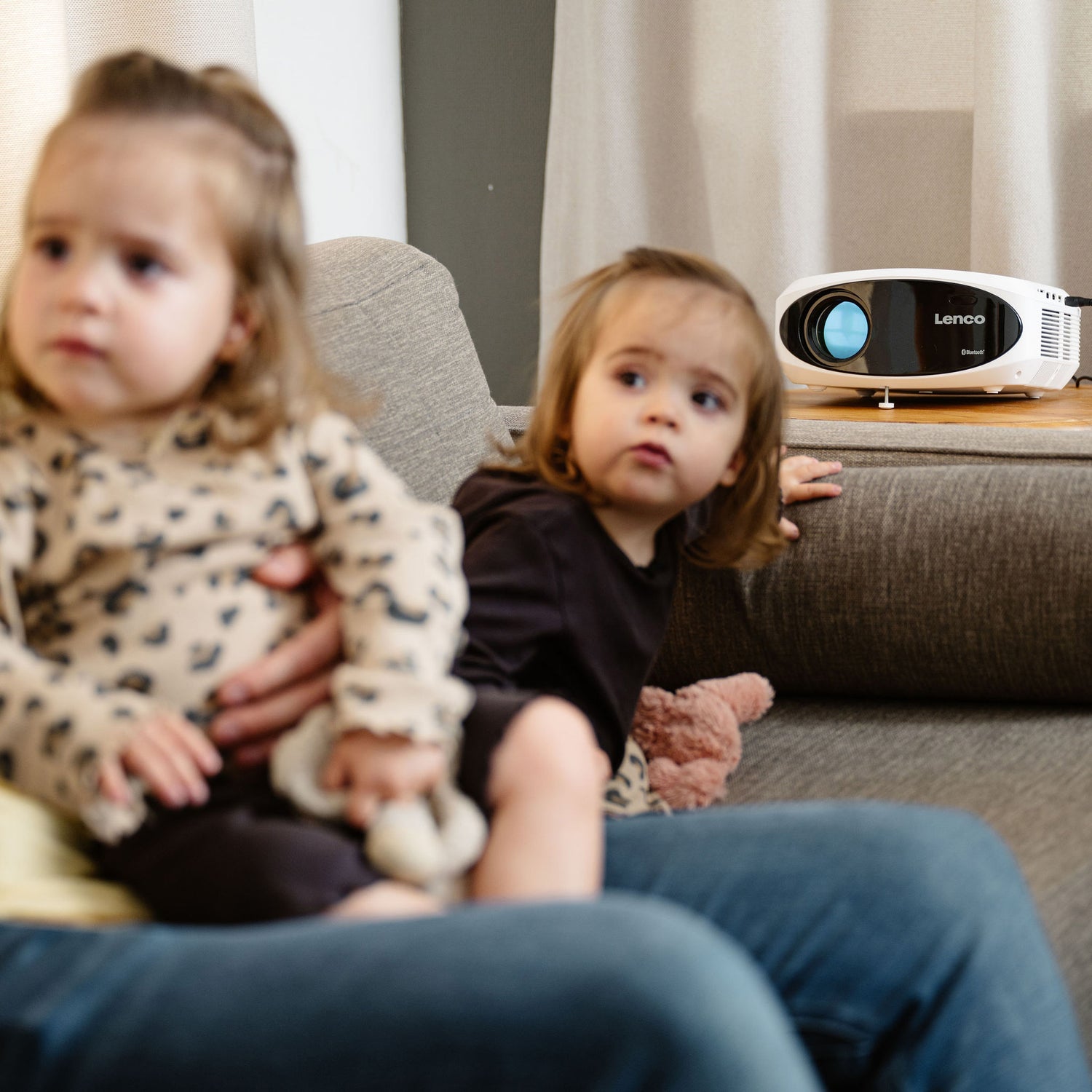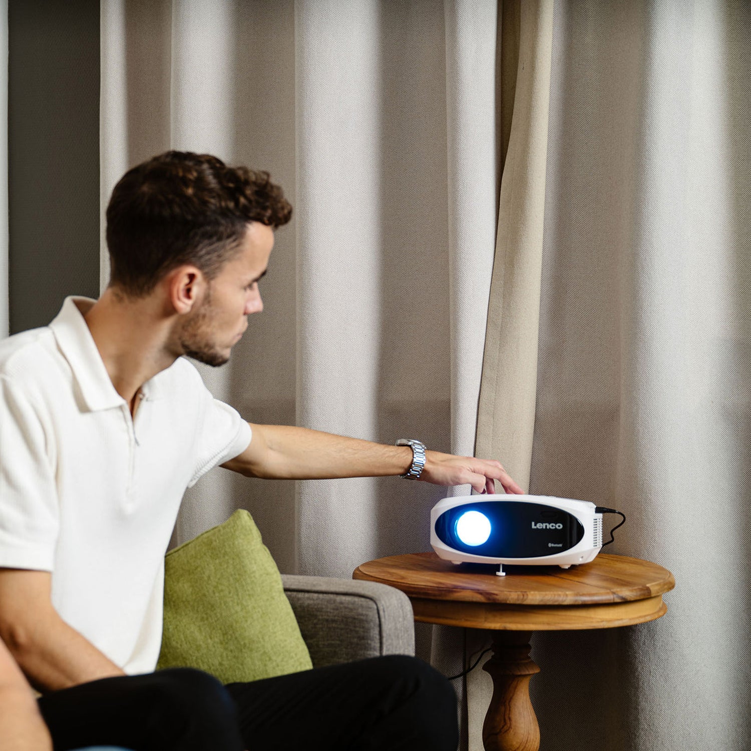 Mit dem LCD-Projektor LPJ-900WH von Lenco können Sie alle Ihre Filme, Spiele und Präsentationen gestochen scharf projizieren. Der Projektor ist einfach zu transportieren und zu bedienen. Schalten Sie ihn ein, stellen Sie den Fokus und die Höhe ein, und schon können Sie loslegen. Mit den eingebauten Stereolautsprechern können Sie sich auf einen guten Klang verlassen. Der Projektor ist mit Bluetooth® ausgestattet, so dass Sie den Filmton kabellos an eine externe Bluetooth®-Soundbar oder einen Lautsprecher senden können. Der LPJ-900 verfügt außerdem über die üblichen Audio- und Videoeingänge wie HDMI, USB und SD.