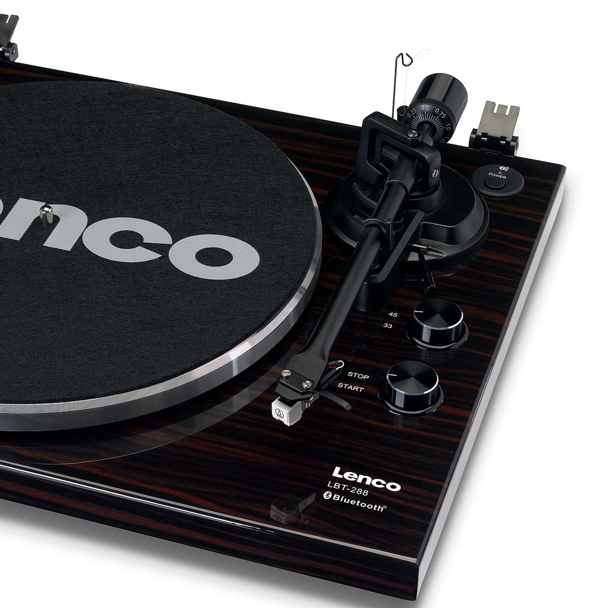 Der Lenco LBT-288WA ist ein moderner Plattenspieler mit Bluetooth® Funktion. Der Plattenspieler lässt sich kinderleicht an externe Lautsprecher über den Cinch-Anschluss auf der Rückseite des Plattenspielers oder über Bluetooth, anschließen. Ebenso lässt sich jedes andere Bluetooth-Gerät, wie z.B. ein Kopfhörer oder tragbarer Bluetooth-Lautsprecher damit ansteuern. So können Sie zu Hause auf dem Sofa einen vollen und warmen Klang genießen. Holen Sie Ihre alten Platten vom Dachboden und spielen Sie diese mit diesem modernen Plattenspieler ab. Ob Einzel- oder Langspielplatte (LP), Sie können die Geschwindigkeit leicht von 33 auf 45 U/min abändern. Schützen Sie Ihre Platten dank des mitgelieferten Anti-Skating-Gegengewichts, welches Sie individuell einstellen können. Dieser Plattenspieler Lenco LBT-288WA verfügt über einen Metalldrehteller, Riemenantrieb und einen hochwertigen Audio-Technica-Tonabnehmer. Die Staubschutzhaube sorgt dafür, dass Ihr Plattenspieler nicht unter einer Staubschicht verschwindet und vor Beschädigungen von außen geschützt ist. Ein CE-UK Multistecker (Netzkabel) ist im Lieferumfang enthalten. Damit Ihre Lieblingsmusik nicht verloren geht, können Sie Ihre kostbare Vinylsammlung ganz einfach mit dem Lenco LBT-288 digitalisieren. Schließen Sie den Plattenspieler über den USB-Anschluss an Ihren Computer an, und die Arbeit ist getan.