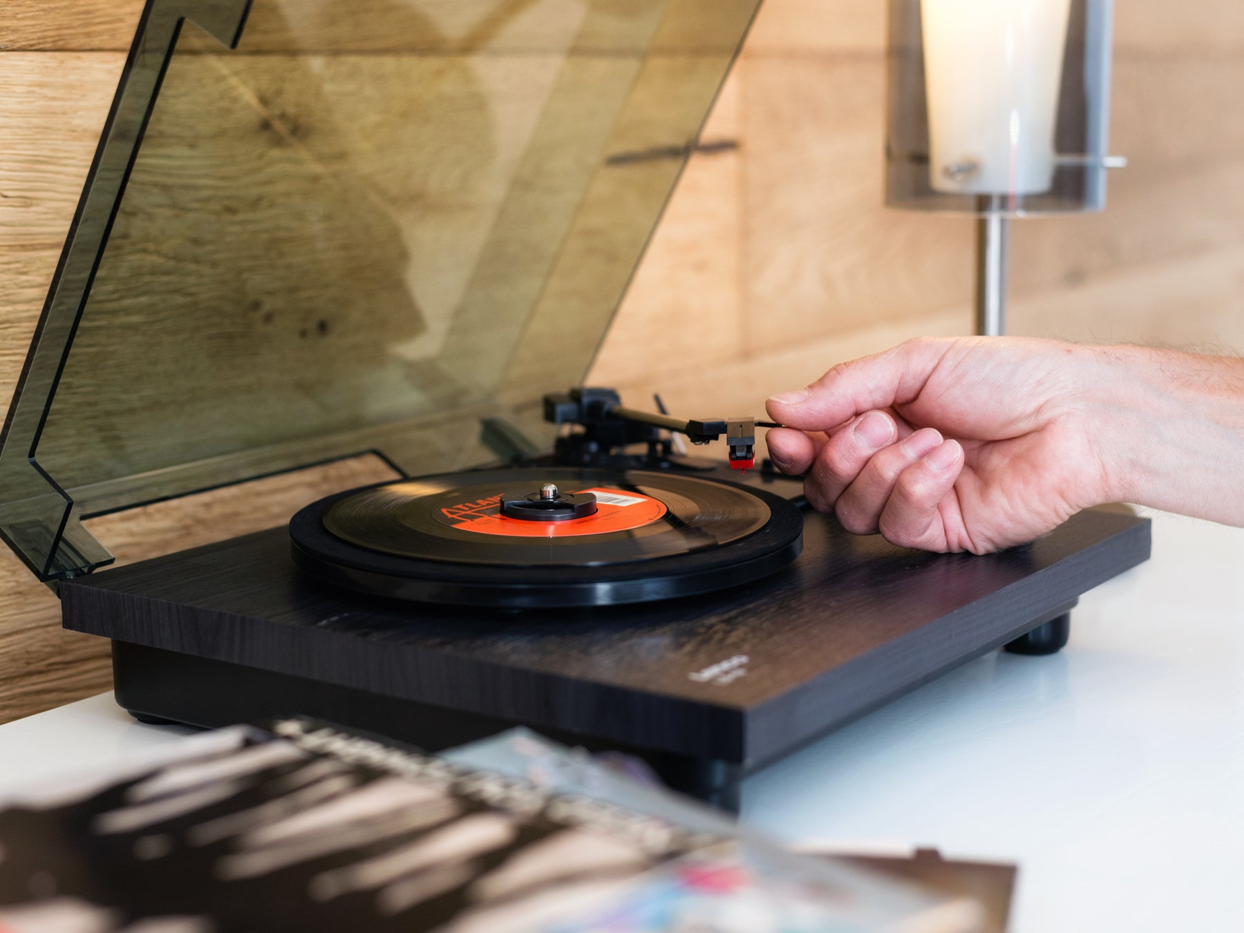 Der Lenco LS-10WD ist ein kompakter Plattenspieler, mit dem Sie Ihr Lieblings-Vinyl ganz einfach auf Knopfdruck genießen können. Das Gerät versteckt modernste Technik in einem klassischen Gewand und wird mit einem Riemenantrieb betrieben. Vergessen Sie komplizierte Musikinstallationen, denn der Lenco Plattenspieler erweckt Ihre Schallplatten mühelos zum Leben. Ob Einzel- oder Langspielplatte (LP), Sie können die Geschwindigkeit leicht von 33 auf 45 U/min abändern. Falls Ihnen die bereits integrierten Lautsprecher von jeweils 3 Watt RMS nicht ausreichen, ist der Plattenspieler kinderleicht an externe Lautsprecher über den RCA-Anschluss auf der Rückseite des Plattenspielers anzuschließen. So ist jeder Raum mit Ihrer Musik gefüllt. Für eine private Musiksession verfügt der Plattenspieler zusätzlich über einen Kopfhöreranschluss. Der Lenco LS-10 wird mit einer abnehmbaren Staubschutzhaube geliefert, die den Plattenspieler vor Staubbildung schützt. Das Gerät lässt sich leicht mit einem weichen, trockenen Tuch sauber halten und die Nadel können Sie leicht selbst austauschen. Der Lenco LS-10 ist in schwarz (Lenco LS-10BK) und holz (Lenco LS-10WD) erhältlich.